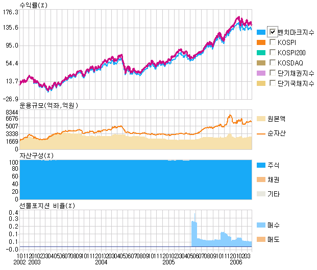 ÃÖ±Ù 1³â ÆÝµå ¼öÀÍ·üÀº 31.77%¿´´Ù. °°Àº ±â°£ KOSPI200Àº 31.38%¿´À¸¸ç, À¯ÇüÆò±ÕÀº 32.23%¿´´Ù. ÃÖ±Ù 2³â ¹× 3³âÀº 43.49%, 149.18%¿´À¸¸ç, KOSPI200Àº °¢°¢ 43.74%, 144.86%·Î 3³â ¼öÀÍ·üÀ» Á¦¿ÜÇÏ¸é ½ÃÀå°ú °ÅÀÇ À¯»çÇÑ ¼öÀÍ·üÀ» ±â·ÏÇß´Ù.