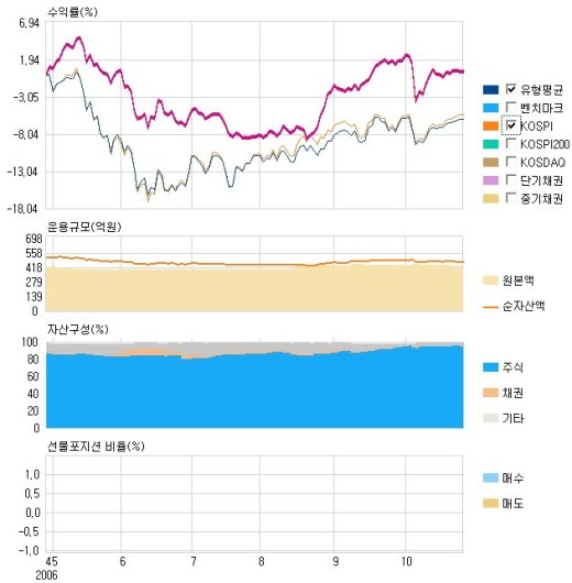 ÀÌ ÆÝµå´Â ÃÖ±Ù 6°³¿ù ´©Àû¼öÀÍ·üÀÌ 1.32%·Î µ¿ÀÏ À¯Çü³» 1À§¸¦ Â÷ÁöÇÒ Á¤µµ·Î ¿ì¼öÇßÁö¸¸ ÃÖ±Ù 1³âÀ» ±âÁØÀ¸·Î º¸¸é 1.34%·Î À¯Çü ³» 98%·Î ÃÖÇÏÀ§ ¼º°ú¸¦ º¸¿´´Ù. ¼º°úº¯µ¿ÀÌ ½ÉÇÑ ÀÌÀ¯·Î´Â ¿¬ÃÊÈÄ µî¶ôÀÌ ½ÉÇß´ø Áß¼ÒÇüÁÖ Æ¯È÷ ÄÚ½º´Ú Á¾¸ñÅõÀÚºñÁßÀÌ À¯Çü´ëºñ ³ô¾Ò±â ¶§¹®ÀÌ´Ù. ±â°£ º°·Î »ìÆìº¸¸é ÀÌ °°Àº Çö»óÀº ´õ¿í µÎµå·¯Áø´Ù. ¿Ã 6¿ù -5.36%·Î ÃÖÇÏÀ§±ÇÀ» Â÷ÁöÇß´ø ÆÝµå´Â 06³â ÇϹݱâ ÀåÇϼºÆÝµå È¿°ú·Î IT ¹× Áß¼ÒÇüÁÖ°¡ °¼¼¸¦ ³ªÅ¸³»¸é¼ 8,9¿ù °¢°¢ 7.25%, 2.00%ÀÇ ¼öÀÍ·üÀ» ±â·ÏÇϸç %¼øÀ§ 1,2À§·Î ¿Ã¶ó¼¹´Ù. ¿¬ÃÊ ÈÄ -0.23%, %¼øÀ§ 20À§·Î ¼¼È÷ ¼öÀÍ·üÀ» ȸº¹Çϰí ÀÖ´Ù.