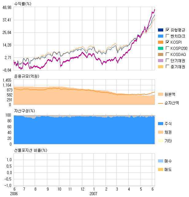 ÀÌ´Â ¿¬ÃÊ ÈÄ ´ëÇüÁÖ°¡ 19.55%ÀÇ »ó½Â¿¡ ±×ÃÆÁö¸¸ Áß¼ÒÇüÁÖ´Â °¢°¢ 32.58%, 36.86%·Î ´õ Å« ÆøÀ¸·Î »ó½ÂÇÏ¸é¼ Áß¼ÒÇüÁÖ¿¡ ´ëºÎºÐÀ» ÅõÀÚÇÏ´Â ÆÝµå Ư¼º»ó ´õ Å« ¼öÇý¸¦ ÀÔ¾ú±â ¶§¹®ÀÌ´Ù. ÀÌ °¡¿îµ¥ ¹ü¿ìÀÌ¿£Áö(¡â25.62%),Áø¼ºÆ¼À̾¾(¡â80.58%), »ï¿µ¿¥ÅØ(¡â73.26%), S&TC(¡â58.20%)µîÀÇ ¶Ù¾î³ Á¾¸ñÀÌ µÞ¹Þħ µÆ´Ù. ±×·¯³ª 2006³â 1¿ù°ú °°Àº ´ëÇüÁÖ À§ÁÖÀÇ »ó½ÂÀåÀ̳ª ÄÚ½º´Ú ½ÃÀåÀÌ ¾à¼¼¸¦ º¸¿´´ø ¿Ã ÃÊ À¯Çü ³» ÇÏÀ§±ÇÀ¸·Î ¹Ð·Á³ª±âµµ Çß´Ù. ÀÌ·¸µí ÆÝµåÀÇ ¼º°ú´Â ÁßÇüÁÖ À§ÁÖ »ó½ÂÀå¿¡¼ °ÇÑ ¸é¸ð¸¦ º¸ÀÌÁö¸¸ ´ëÇüÁÖ À§ÁÖ »ó½ÂÀå¿¡¼´Â ¾à¼¼¸¦ ³ªÅ¸³½´Ù. ±×·¯³ª °¼¼¿Í ¾à¼¼°¡ ±³Ã¼ÇÏ´Â 1³â ÀÌ»ó ±â°£¿¡¼´Â Áß»óÀ§±Ç¿¡ ¾ÈÂøÇϰí ÀÖ´Ù.