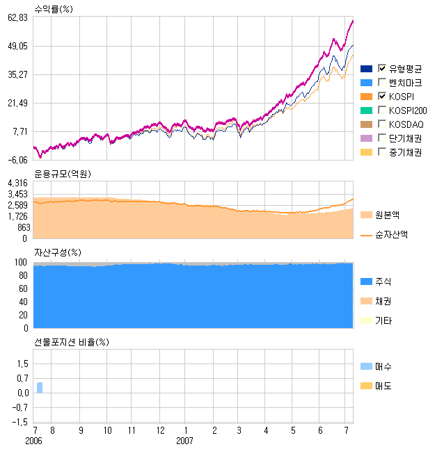 ÀÌ ÆÝµåÀÇ ¼öÀÍ·üÀº 2006³â ÇÑÇØ 0.92%·Î ÁÖ½ÄÆÝµåµé °¡¿îµ¥ Áß°£¼öÁØÀÇ ÆòÀÌÇÑ ¼º°ú¸¦ ³ÂÀ½¿¡µµ ºÒ±¸Çϰí 2005³â 1³â°£ 97.15%ÀÇ °í¼öÀÍÀ» ³½ °Í°ú 2007³â 7¿ù ÇöÀç ¿¬ÃÊ ÈÄ 38.84%ÀÇ ¼öÀÍÀ» ³»¸é¼ ÃÖ±Ù 3³â°£ ¼º°ú°¡ ±¹³»ÁÖ½ÄÆÝµå Áß °¡Àå ³ôÀº 229.73%¸¦ ±â·ÏÇÏ´Â µî ´Ü±âº¸´Ù Àå±â¼º°ú°¡ ¿ì¼öÇÑ ¸éÀ» º¸¿©ÁÖ°í ÀÖ´Ù.