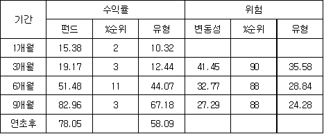11¿ù 1ÀÏ ±âÁØÀ¸·Î ¿¬ÃÊÈÄ ¼öÀÍ·üÀº 78.05%·Î ¼ºÀåÇü ÆÝµå Áß¿¡¼µµ ÃÖ»óÀ§±ÇÀ» ±â·ÏÇϰí ÀÖÀ¸¸ç 1°³¿ù°ú 3°³¿ù ¼öÀÍ ¿ª½Ã 15.38%¿Í 19.17%·Î °¢°¢ %¼øÀ§ 2, 3À§¸¦ Â÷ÁöÇϰí ÀÖ´Ù.