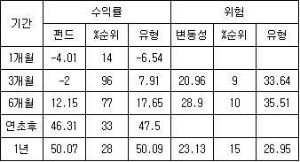 ÀÌ ÆÝµå´Â »ó½ÂÀå¿¡¼´Â ´ú ¿À¸£°í Ç϶ôÀå¿¡¼´Â ±×¸¸Å ´ú Ç϶ôÇÏ´Â °¡Ä¡ÁÖÆÝµåÀÇ Æ¯Â¡À» Àß ³ªÅ¸³» ÁÖ°í ÀÖ´Ù. ´ëÇüÁÖ À§ÁÖ·Î ÁÖ°¡°¡ »ó½ÂÇÑ ÃÖ±Ù 3°³¿ù ¼º°ú´Â 2007³â 12¿ù 6ÀÏ ±âÁØÀ¸·Î -2.00%·Î %¼øÀ§ ÃÖÇÏÀ§±ÇÀ» ±â·ÏÇß´Ù. ±×·¯³ª ÁֽĽÃÀåÀÌ ±Þ¶ôÇÑ ÃÖ±Ù 1°³¿ù ¼º°ú¿¡¼´Â À¯ÇüÆò±Õ¿¡ ºñÇØ ¾çÈ£ÇÑ -4.01%·Î ¼öÀÍ·ü ¹æ¾î°¡ ¶Ù¾î³ ¸ð½ÀÀ» º¸¿´´Ù.