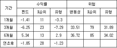 10¿ù¸» ÇöÀç ÀÌ ÆÝµå´Â 47°³ Á¾¸ñ¿¡ ÅõÀÚÇϰí ÀÖÀ¸¸ç ÀÌ´Â µ¿ÀÏ À¯Çüº¸´Ù ÀÛ¾Æ ÆÝµå ÀüüÀÇ º¯µ¿¼ºÀ» Å©°Ô ³ªÅ¸³ °ÍÀ¸·Î º¸¿© Áø´Ù. ½ÇÁ¦·Î °¢ ±¸°£(3°³¿ù, 6°³¿ù)º° ÆÝµå ¼öÀÍ·üÀÇ º¯µ¿¼ºÀ» ÀǹÌÇϴ ǥÁØÆíÂ÷´Â °¢°¢ 33.51%, 36.72%¸¦ ±â·Ï, À¯Çü¿¡ ºñÇØ ³ô°Ô ³ªÅ¸³µ´Ù.