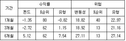 ¹Ý¸é ÅõÀÚÀ§Çèµµ¸¦ ³ªÅ¸³»´Â ÃÖ±Ù 6°³¿ù ¼öÀÍ·ü º¯µ¿¼ºÀº 27.11%·Î ³ªÅ¸³µÀ¸³ª ÃÖ±Ù 3°³¿ù ¼öÀÍ·ü º¯µ¿¼ºÀº 18.92%·Î µ¿³²¾ÆÁÖ½ÄÆÝµå Æò±Õ(21.16%)¿¡ ºñÇØ ´Ù¼Ò ³·Àº ÆíÀÌ´Ù. ÀÌ´Â ¼±Áø±¹ÀÎ ½Ì°¡Æ÷¸£¿¡ ´ëÇÑ ÅõÀÚºñÁßÀÌ ´Ù¸¥ ÆÝµåµéº¸´Ù ³ô±â ¶§¹®ÀÌ´Ù.