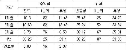 2007³â 3¿ù ¼³Á¤µÅ 1³â Á¤µµ ¿î¿ëµÈ ÆÝµåÀÇ ÃÖ±Ù 3°³¿ù ¼öÀÍ·üÀº 10.69%·Î À¯ÇüÆò±Õ ¼öÀÍ·ü 12.46%¸¦ ÇÏȸÇϰí ÀÖÁö¸¸, 1³â ¼öÀÍ·üÀÌ 28.25%·Î À¯·´½ÅÈï±¹ÁÖ½Ä ÆÝµå °¡¿îµ¥ »óÀ§ 25%¿¡ µå´Â ¾çÈ£ÇÑ ¼º°ú¸¦ º¸À̰í ÀÖ´Ù.