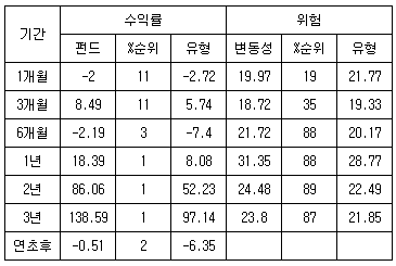 ÆÝµåÀÇ ÃÖ±Ù 1³â¼öÀÍ·üÀº 18.39%·Î À¯ÇüÆò±ÕÀ» 10%Æ÷ÀÎÆ® ÀÌ»ó »óȸÇϸç %¼øÀ§ 1À§¸¦ Â÷ÁöÇϰí ÀÖ´Ù. ÆÝµåÀÇ ¼º°ú´Â Àå±â·Î °¥¼ö·Ï ´õ¿í ºûÀ» ¹ßÇϰí Àִµ¥ 2³â, 3³â ¼º°ú ¿ª½Ã À¯Çü³» %¼øÀ§ 1À§¸¦ ±â·ÏÇϰí ÀÖ´Ù.
