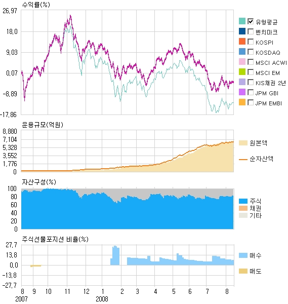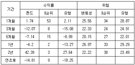 ¼³Á¤Ãʱâ Áß±¹°æÁ¦ÀÇ ±Þ»ó½Â¿¡µµ ºÒ±¸ÇÏ°í ¼öÀÍ·üÀÌ ÁÖÃãÇß´ø ÀÌ ÆÝµå´Â Áö³ 2007³â ÇϹݱâ ÀÌÈĺÎÅÍ ´«¿¡ ¶ç°Ô º¯ÈµÈ ¸ð½ÀÀ» º¸À̰í ÀÖ´Ù. ÆÝµå ¼º°úµµ À¯ÇüÆò±ÕÀ̳ª BM´ëºñ ³ô¾ÆÁö°í ÀÖ°í 100¾ï¿ø´ë±îÁö ÁÙ¾îµé¾ú´ø ÆÝµåÀÇ ¼öŹ°íµµ 2007³â 5¿ùºÎÅÍ Áõ°¡¼¼·Î Àüȯ, ÃÖ±Ù¿¡´Â 6,600¾ï¿ø´ë·Î Å« Æø ´Ã¾î³µ´Ù. ÃÖ±Ù 1³â°£ ÆÝµåÀÇ ¼öÀÍ·üµµ -4.20%·Î À¯ÇüÆò±ÕÀÎ -13.27%¸¦ Å©°Ô »óȸÇϰí ÀÖ´Ù.