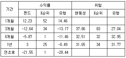 ÇÑÆí ÆÝµå ¼öÀÍ·üÀÇ º¯µ¿¼ºÀ» º¸¿©Áִ ǥÁØÆíÂ÷·Î À§Çè¼öÁØÀ» ÃøÁ¤ÇÑ °á°ú, ÃÖ±Ù 1³â°£ ÆÝµå´Â 31.65%ÀÇ ³ôÀº º¯µ¿¼ºÀ» º¸¿´´Ù. ÀÌ´Â º¯µ¿¼ºÀÌ Å« ½ÅÈï±¹ ÅõÀÚ ºñÁßÀÌ ³ô°í ȯÀ§Çè¿¡ ³ëÃâµÇ¾î ÀÖ´Ù´Â Á¡¿¡¼ À§Çè¼öÁØÀº °áÄÚ ³·Áö ¾Ê´Ù´Â °ÍÀ» º¸¿©ÁØ´Ù.