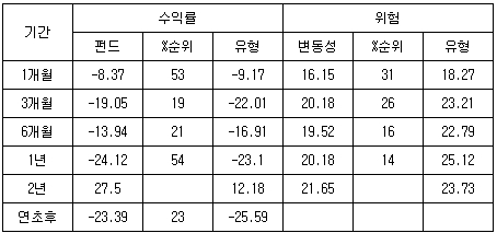 ÀÌ ÆÝµåÀÇ À§ÇèÁöÇ¥¸¦ »ìÆìº¸¸é À¯ÇüÆò±Õ¿¡ ºñÇØ ¾ÈÁ¤ÀûÀÎ °ÍÀ¸·Î ³ªÅ¸³ª°í ÀÖ´Ù. ¼öÀÍ·üÀÇ º¯µ¿¼ºÀ» ³ªÅ¸³»´Â Ç¥ÁØÆíÂ÷´Â ÃÖ±Ù 2³â°£ 21.65%·Î À¯ÇüÆò±Õ(23.73%)º¸´Ù ÀÛ´Ù. ¶ÇÇÑ ½ÃÀåÀÇ ¹Î°¨µµ¸¦ ³ªÅ¸³»´Â º£Å¸°è¼öµµ 0.95¸¦ ±â·ÏÇØ ½ÃÀå¿¡ ºñÇØ ¾ÈÁ¤ÀûÀ¸·Î ¿òÁ÷¿´À½À» º¸¿©ÁÖ°í ÀÖ´Ù. À§Çè´ëºñ Ãʰú¼öÀÍÀ» ³ªÅ¸³»´Â »þÇÁÁö¼ö´Â 0.39·Î À¯ÇüÆò±Õ(0.08)¿¡ ºñÇØ ³ô°Ô ³ªÅ¸³µ´Ù.