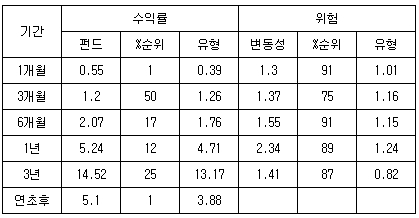 ÃÖ±Ù 3°³¿ù µ¿¾È 1.20%ÀÇ ¼öÀÍÀ» ±â·ÏÇϰí ÀÖ´Â ÀÌ ÆÝµå´Â À¯ÇüÆò±Õ(1.26%)¿¡ ºñÇØ ºÎÁøÇÑ ¼º°ú¸¦ º¸À̰í ÀÖ´Ù. ÇÏÁö¸¸ 1³â°ú 2³âÀÇ ¼º°ú´Â °¢°¢ 5.24%¿Í 9.22%·Î À¯ÇüÆò±Õ¿¡ ºñÇØ ³ôÀº ¼öÀÍ·üÀ» ±â·ÏÇß´Ù.