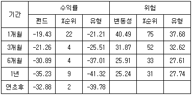 ÆÝµåÀÇ 3°³¿ù°ú 1³â ¼öÀÍ·üÀº °¢°¢ -21.26%, -35.23%·Î À¯ÇüÆò±Õ ¼öÀÍ·üº¸´Ù 4.23%Æ÷ÀÎÆ®, 6.09%Æ÷ÀÎÆ® ³ôÀº ¸ð½ÀÀ» º¸À̰í ÀÖ´Ù. Ç¥ÁØÆíÂ÷´Â Áö³ 1³âµ¿¾È 25.24%¸¦ ±â·Ï, °°Àº À¯ÇüÀÇ ÆÝµå(27.74%)º¸´Ù ³·Àº ¼öÀÍ·ü º¯µ¿¼ºÀ» º¸¿©Áá´Ù.