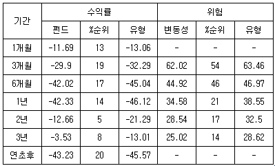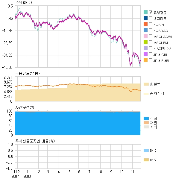 2008³â 11¿ù 20ÀÏ ±âÁØÀ¸·Î ÃÖ±Ù 1°³¿ù ¼öÀÍ·üÀº -11.69%·Î ¼Õ½ÇÀ» º¸°í´Â ÀÖÁö¸¸ ÆÝµå°¡ ¼ÓÇÑ ÀϹÝÁÖ½Ä À¯ÇüÆò±Õ ¼öÀÍ·üÀÎ -13.04%º¸´Ù´Â ³ô´Ù. Á»´õ ±æ°Ô º¸´õ¶óµµ, 1³â¼º°ú -42.33%(À¯ÇüÆò±Õ -46.12%), 2³â ¼º°ú´Â -12.66%(À¯Çü -21.27%)·Î Àü ±¸°£¿¡¼ À¯ÇüÆò±ÕÀ» »óȸÇϰí ÀÖ´Ù.