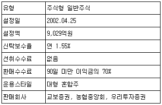 2005³â 9¿ù ¼öŹ°í°¡ 100¾ï¿øÀ¸·Î ´Ã¾î³ª¸é¼ º»°ÝÀûÀ¸·Î ¿î¿ëÀÌ ½ÃÀÛµÈ ÆÝµå´Â ¼öŹ°í°¡ Áö¼ÓÀûÀ¸·Î Áõ°¡ÇÔ¿¡ µû¶ó Áß¼ÒÇüÁÖ¸¦ Áß½ÉÀ¸·Î Çß´ø ÅõÀÚ Æ÷Æ®Æú¸®¿À¸¦ ´ëÇüÁÖ Áß½ÉÀ¸·Î ÀüȯÇß´Ù. 2008³â 8¿ù¸» ±âÁØÀ¸·Î ÆÝµå°¡ ½ÇÁ¦ ÅõÀÚÇϰí ÀÖ´Â ´ëÇüÁÖ ºñÁßÀº 65.25%, Áß¼ÒÇüÁÖ ÅõÀÚ ºñÁßÀº 34.74%·Î ´ëÇüÁÖ ºñÁßÀÌ ´õ ³ô´Ù.