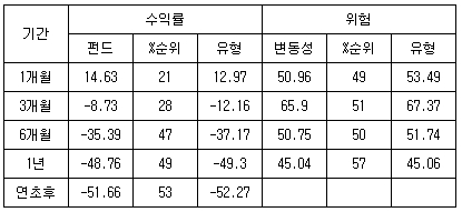 12¿ù 18ÀÏ ±âÁØÀ¸·Î ÆÝµåÀÇ ÃÖ±Ù 1°³¿ù ¼öÀÍ·üÀº 14.63%·Î BM¼öÀÍ·ü(19.37%) º¸´Ù´Â ³·Áö¸¸ Áß±¹ÁÖ½Ä À¯ÇüÆò±Õ ¼öÀÍ·üÀ» »óȸÇÏ´Â ¼ºÀûÀ» ±â·ÏÇϰí ÀÖ´Ù. 6°³¿ù°ú 1³â ¼öÀÍ·ü ¿ª½Ã -35.39%, -48.76%·Î À¯ÇüÆò±Õ¼öÀÍ·üº¸´Ù´Â ¾çÈ£ÇßÁö¸¸ BM¼öÀÍ·ü¿¡´Â ¸ø ¹ÌÄ¡´Â ¼º°ú¸¦ º¸¿´´Ù. ÀÌ´Â ÃÖ±Ù Áß±¹Áõ½Ã°¡ Ç϶ôÇÏ´Â µ¿¾È ÆÝµå¿¡¼ ÅõÀÚºñÁßÀÌ ³ôÀº Á¾¸ñµéÀÌ ´õ Å« ÆøÀ¸·Î ¶³¾îÁø ¹Ý¸é »ó½Â½Ã¿¡´Â Ç϶ôÆøÀ» ¸¸È¸ÇÏÁö ¸øÇ߱⠶§¹®ÀÌ´Ù. ÆÝµåÀÇ ¼öÀÍ·ü º¯µ¿¼ºÀ» ³ªÅ¸³»´Â Ç¥ÁØÆíÂ÷´Â ÃÖ±Ù 1³â°£ ÆÝµå´Â 45.04%¸¦ ±â·Ï, À¯ÇüÆò±Õ°ú ºñ½ÁÇÑ ¼öÁØÀ» º¸À̰í ÀÖ´Ù.