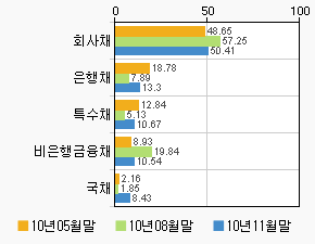 º¯ÈÃßÀ̸¦ º¸¸é, ȸ»çä°¡ 2010³â 5¿ù ¸»ºÎÅÍ 11¿ù ¸»±îÁö 48.65%¿¡¼ 50.41%·Î Áõ°¡Çß´Ù. ÀÌ ¿Ü¿¡µµ ºñÀºÇà±ÝÀ¶Ã¤¿Í ±¹Ã¤´Â ä±Ç ³» ºñÁßÀ» Àû°Ô Â÷ÁöÇϰí ÀÖ´Ù.